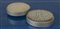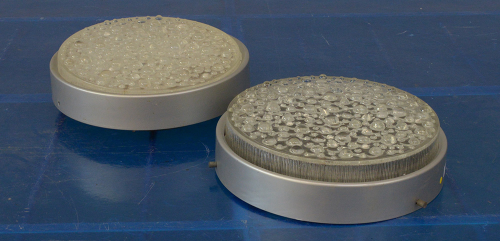 Coppia di plafoniere in alluminio e vetro stampato incolore. Italia, anni '70. (d cm 27) (lievi difetti e mancanze)