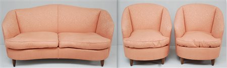 Salottino composto da due poltroncine e un divano a due posti con struttura in legno e rivestimento in tessuto rosa. Italia, anni '50.