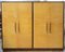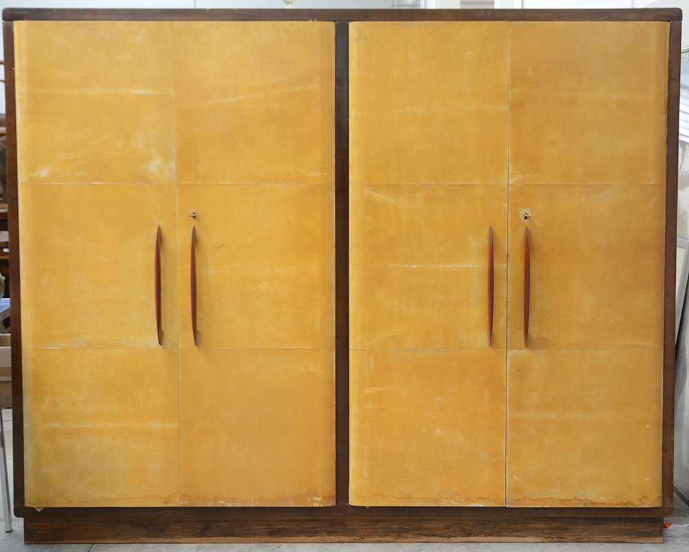 Armadio "razionalista" a quattro ante in legno di mogano impiallacciato con ante rivestite in pergamena, maniglie in legno laccato bordeaux, interni in legno laccato arancione. Italia, anni '30. (cm 223x180x55) (difetti)