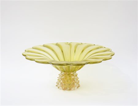 Centrotavola in vetro soffiato con inclusione di foglia d'oro, alzata rostrata e piatto costolato e polilobato. Murano, anni '90/2000. Firmato a punta sotto la base.
