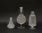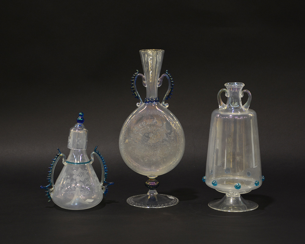Lotto composto da tre vasetti biansati in vetro soffiato trasparente con morise applicate in vetro blu. Epoca recente. (difetti)