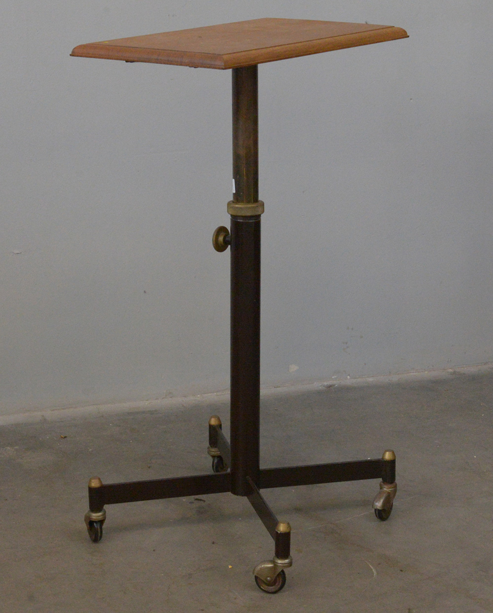 Mobile porta televisore con struttura in metallo verniciato nero e ottone, piano non coevo in legno di rovere. Anni '50. (difetti)