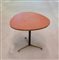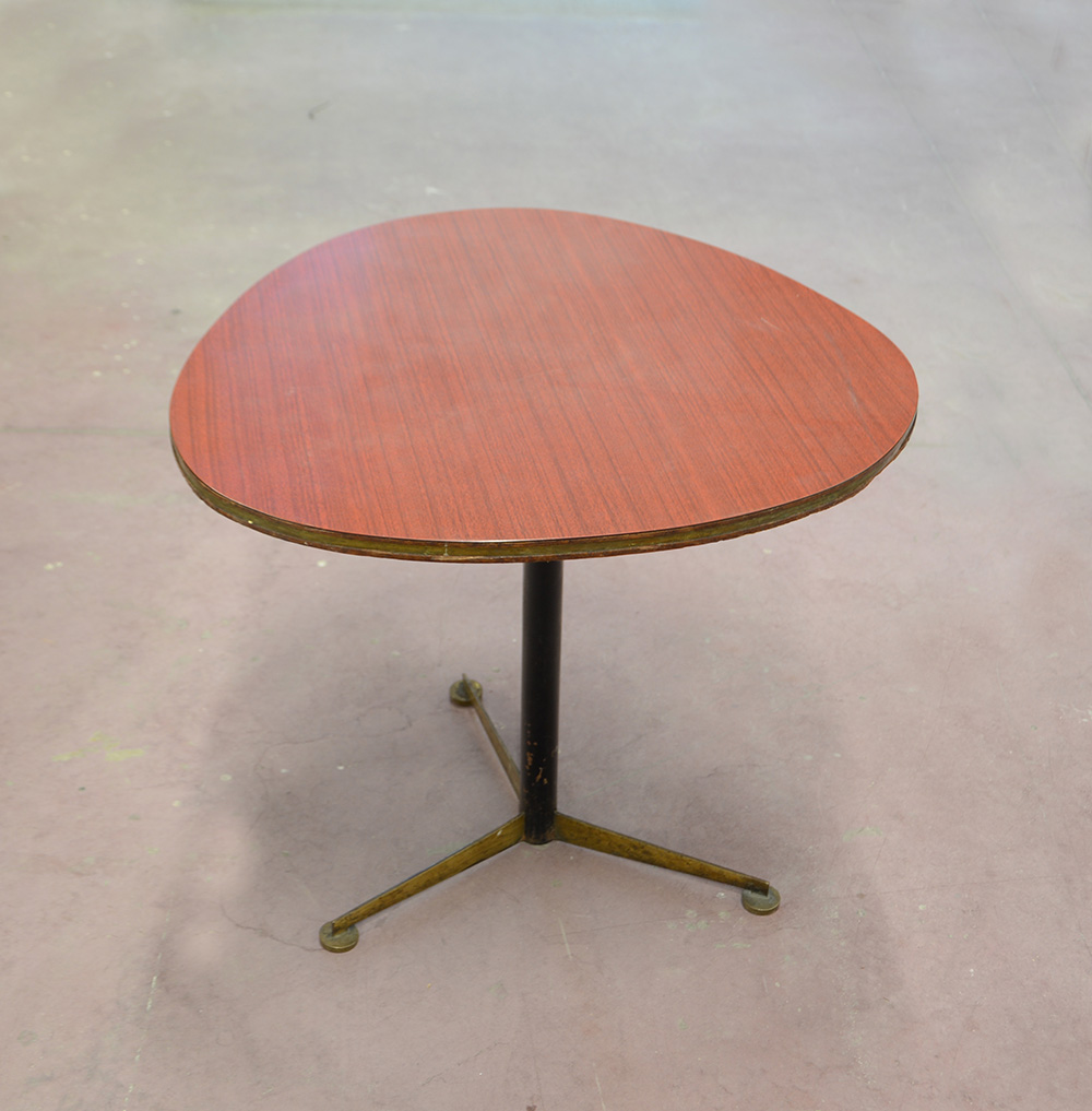 Tavolino con struttura a tripode in ottone e metallo laccato nero, piano stondato in legno rivestito in formica. Ponte San Pietro, anni '50. Recante etichetta della manifattura sotto il piano. (h cm 58,5)