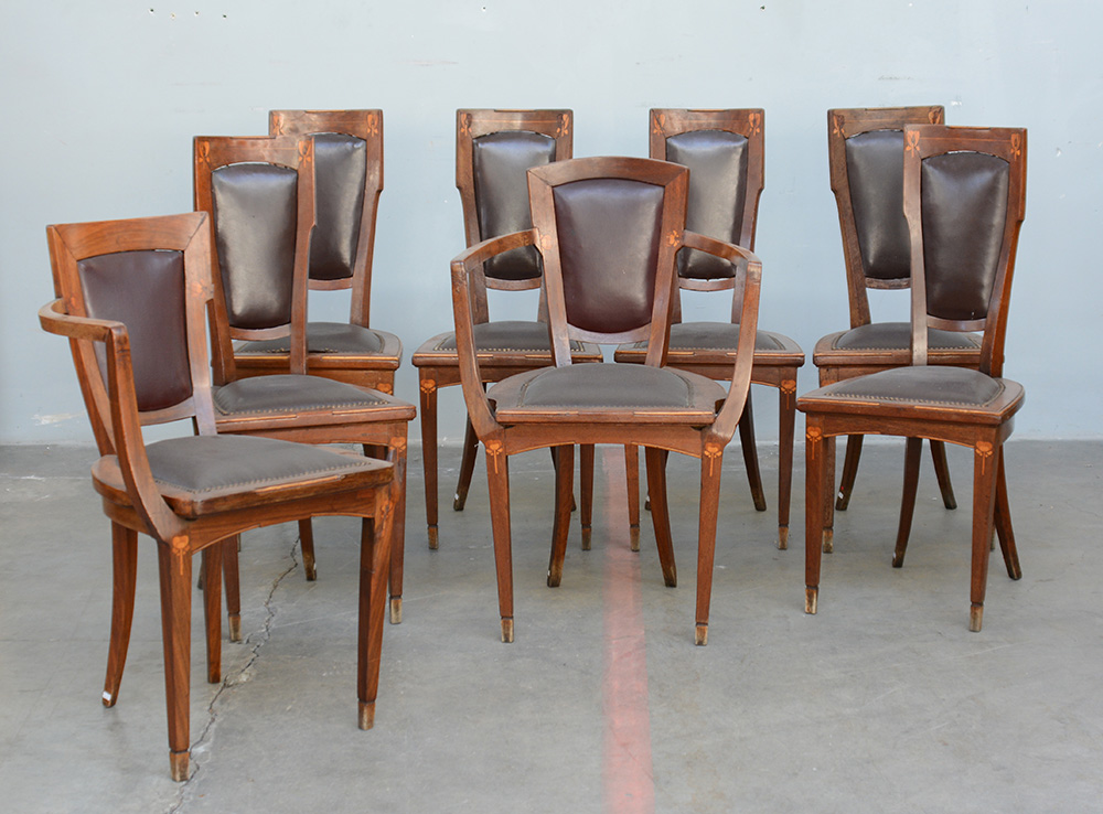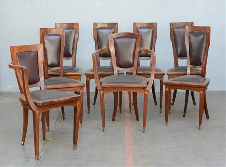 Gruppo di sei sedie e due capitavola liberty. Milano, 1905. Struttura in legno di rovere, intarsi fitomorfi geometrizzati in legno chiaro, seduta e schienale rivestiti in similpelle marrone. (gravi difetti e mancanze)