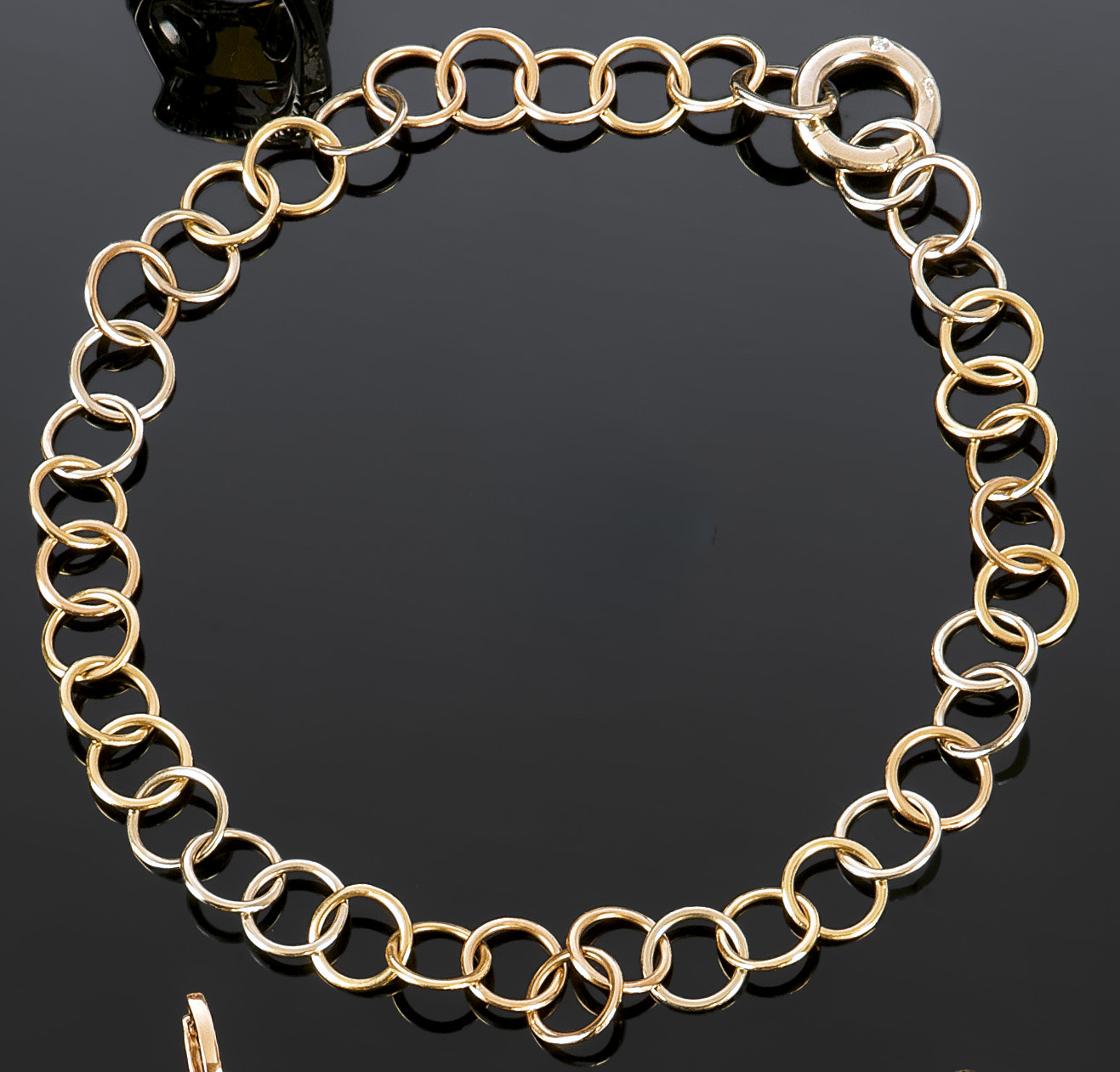 POMELLATO Collana nei tre colori dell'oro, firmata "Pomellato" a maglie circolari concatenate, piccolo diamante taglio brillante rotondo sulla chiusura Peso gr. 36,00