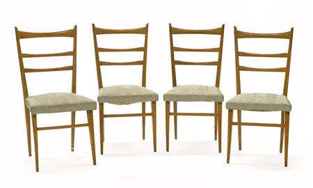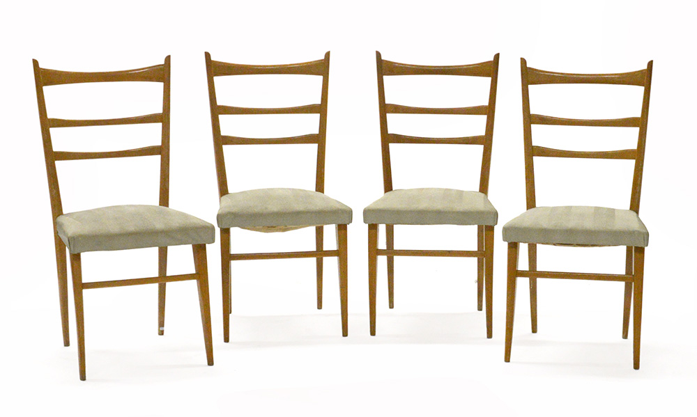 Four chairs. Italy, 1950s. Ash wood, padded seat covered with gray fake leather. (45.5x90.5x50 cm.) (defects)