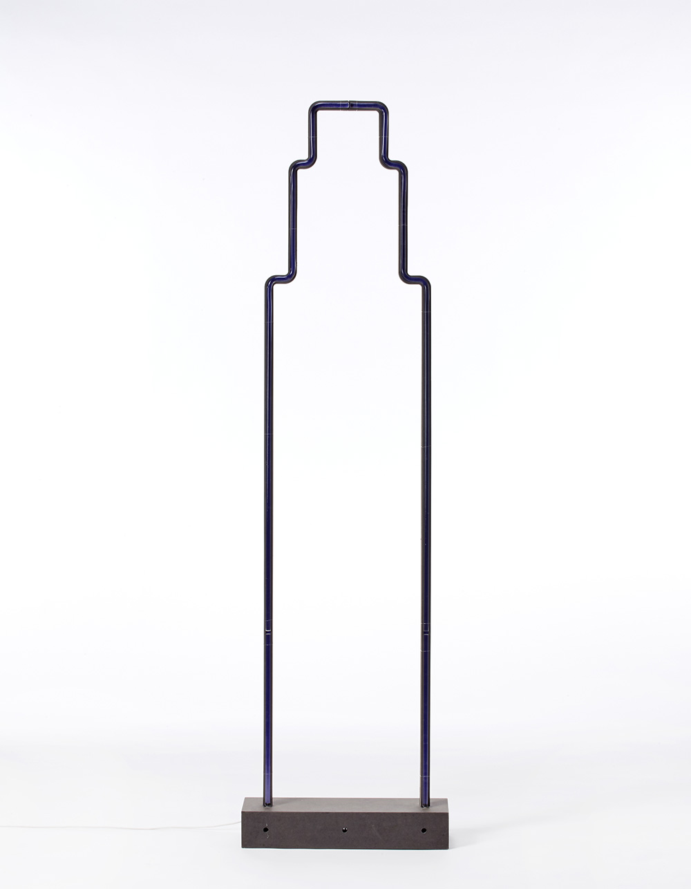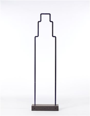 Lampada scultura in plexiglass retroilluminato blu montato su struttura in ferro verniciato e MDF. Produzione recente. (h cm 180) (difetti)