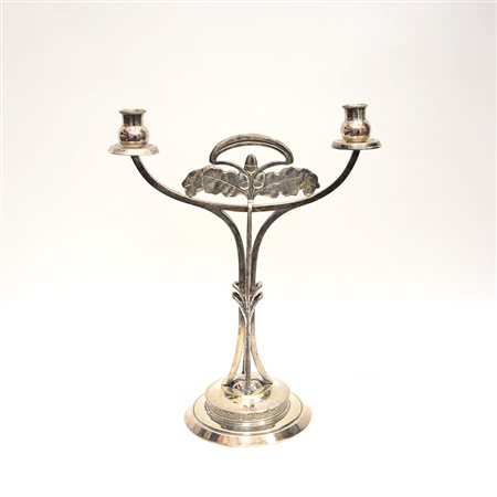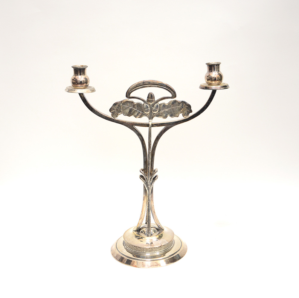Candeliere Art Noveau a due braccia in metallo argentato con decoro a ghiande e foglie di quercia. (h cm 38) (difetti)
