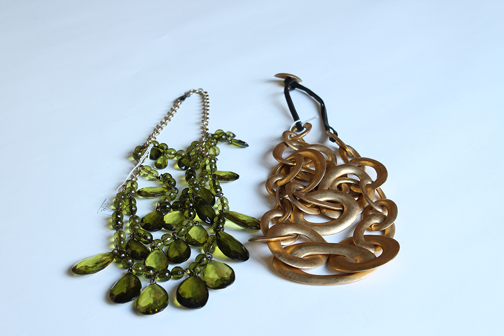 Lotto composto da due grandi collane, una a grandi anelli in materiale plastico color oro e pelle nera, l'altra a boules sfacettate, gocce a charms color oliva e catena color oro satinato