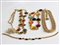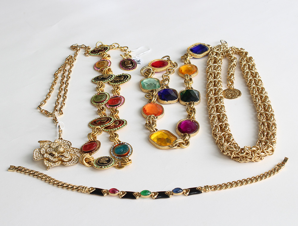 Lotto composto da quattro cinture e un collier, tutto in metallo color oro, rifinite con strass, smalti e grandi pietre fancy colorate