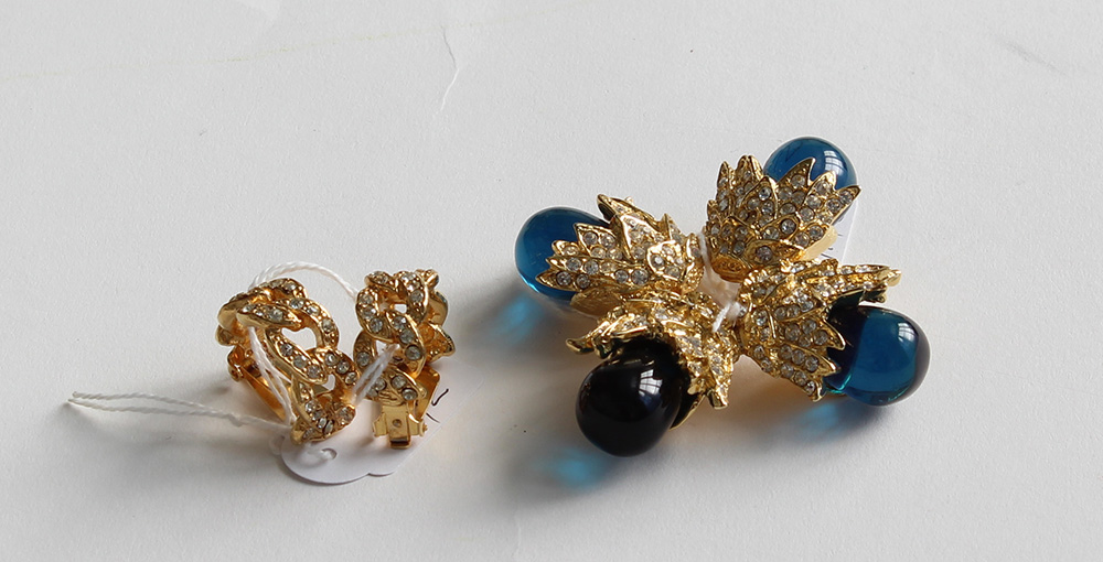 Lotto composto da spille ed orecchini entrambi in metallo color oro e strass, la spilla rifinita con gocce fancy color celeste