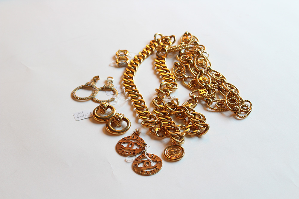 Lotto composto da due cinture e quattro paia di orecchini, tutto in metallo color oro, due paia di orecchini rifiniti in strass