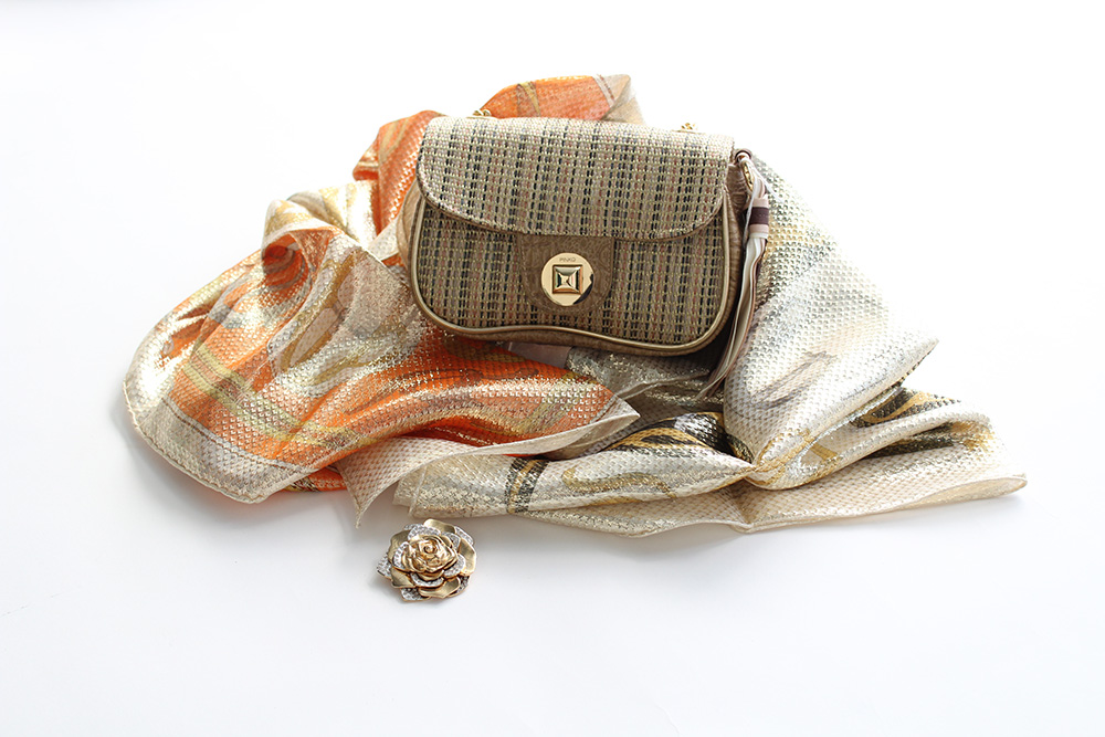 Lotto composto da un spilla a forma di fiore in metallo color oro con strass, una borsetta a tracolla in rafia e similpelle e due minifoulard in seta e polyestere che recano stampa Hermès, tutto sui toni dell'oro