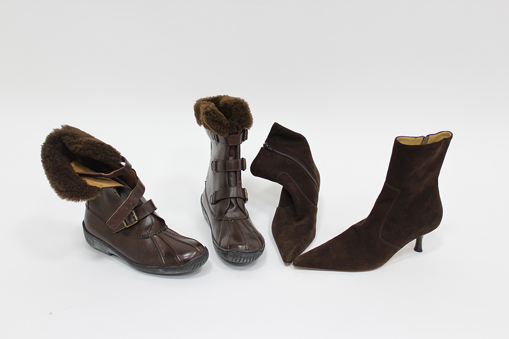 Lotto composta da un paio di dopo sci in cuoio marrone con suola in vibram e un paio di tronchetti in camoscio color testa di moro (tg. 37 e 38)