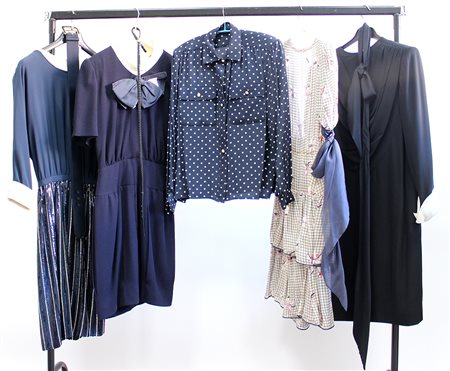 Lotto di quattro vestiti di cui due con cintura e una camicetta nei toni del blu, nero, bianco (tg. differenti) (difetti)