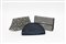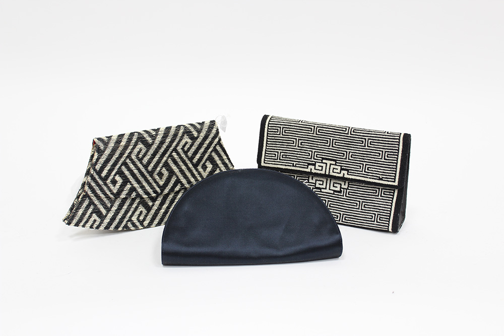 Lotto composto da tre clutch, una in raso blu e le altre in tessuto ricamato con motivi geometrici bianco/nero (cm 26) (difetti e segni d'uso)