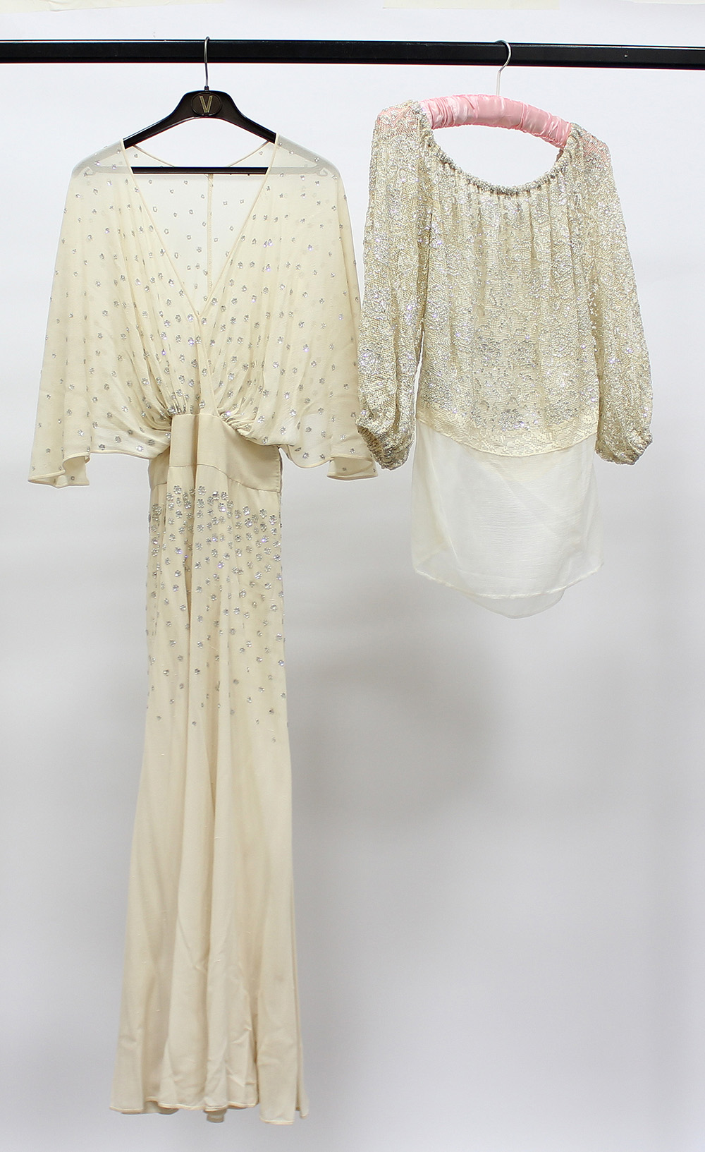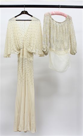 Lotto di un vestito lungo in chiffon con ricami in paillettes e una casacca in pizzo ricamata con paillettes (tg. 44) (difetti)