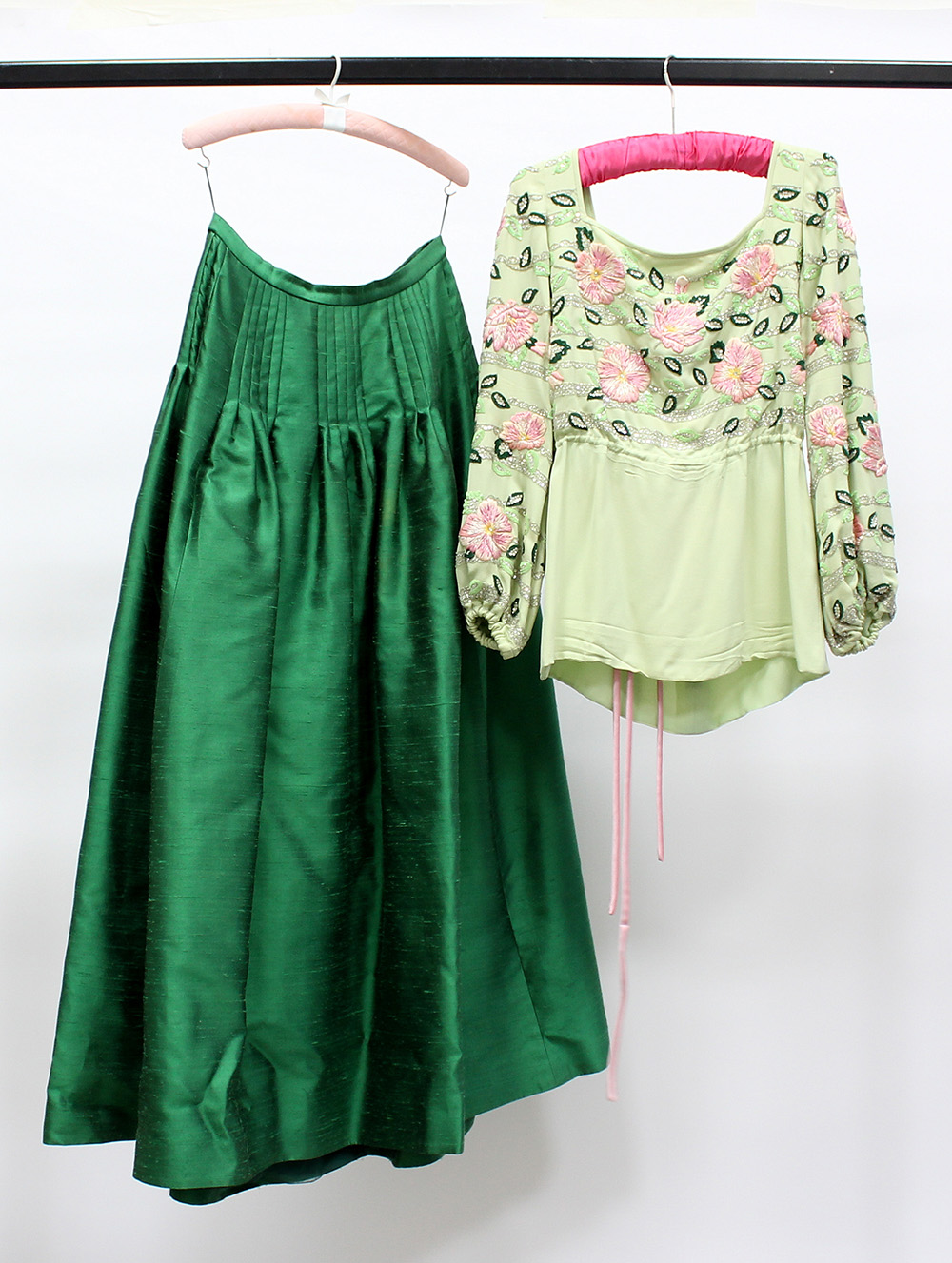 Completo composto da importante gonna in seta verde smeraldo e casacca in chiffon a maniche lunghe ricamata con fiori nei toni del verde e rosa (tg. 44) (lievi difetti)