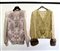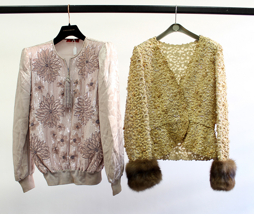 Lotto composto da un giacchino da sera sciancrato interamente ricamato in passamaneria, paillettes e perline nei toni dell'oro e beige e una bluson color rosa antico con maniche in seta stampata ton sur ton e frontale interamente ricamato con paillettes e perline, chiusura a zip con grande nappa (tg. 8) (segni d'uso)