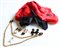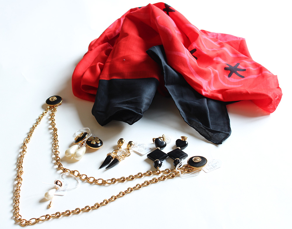 Lotto composto da un pareo in cotone nei toni del rosso e nero, tre paia di orecchini di cui uno in argento galvanizzato oro, uno spillone e due spille collegate da catena caduta in petto in metallo color oro, plastiche, smalti neri e perle fancy