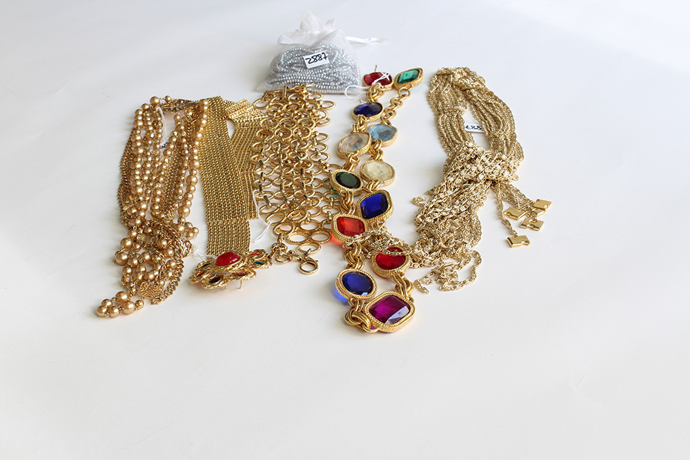 Lotto composto da tre cinture e tre collane lunghe in metallo color oro. Due cinture rifinite con grandi pietre colorate, una collana con perle fancy, una terminata a sciarpa e un'altra formata da 10 fili tutti uguali di boules sfacettate in materiale plastico color metallo su filo elastico