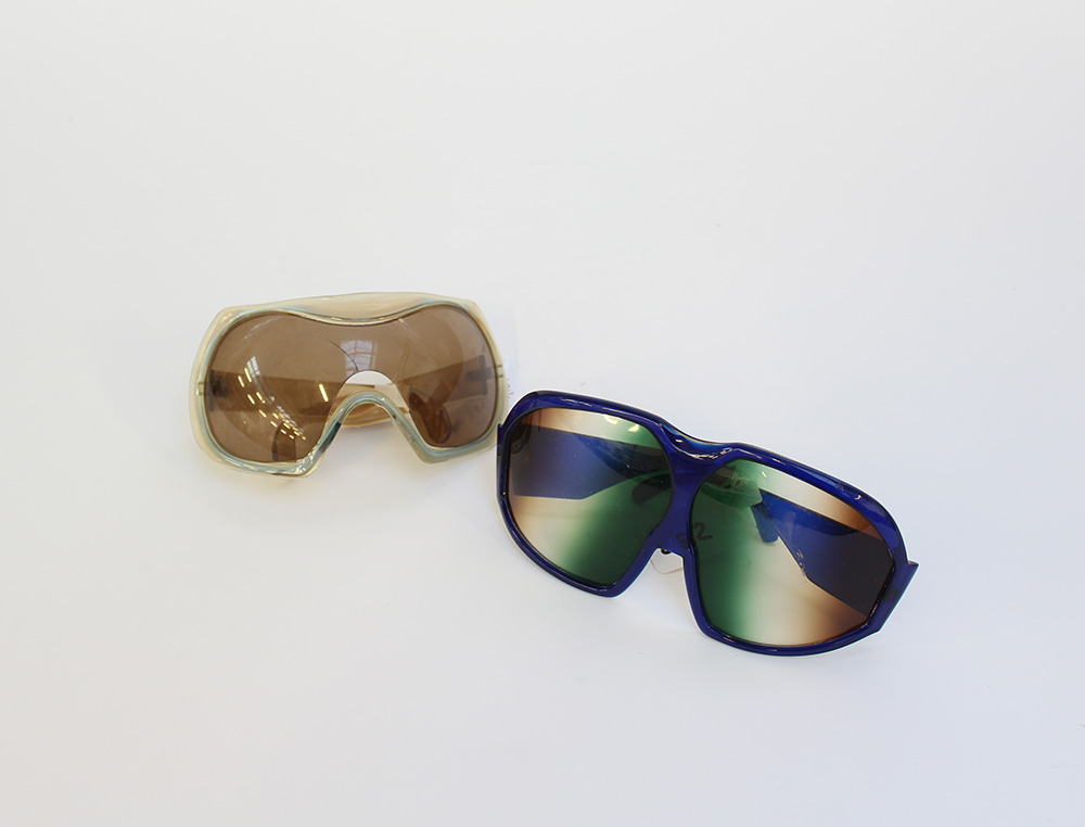 Lotto composto da due paia di occhiali oversize a maschera di cui uno con montatura blu e lenti sfumate dal blu al grigio (difetti)
