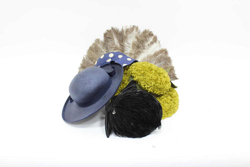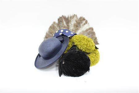 Lotto composto da tre cappelli in diversi colori e materiali, un fascinator in piume color nero e un ventaglio in piume di struzzo (difetti e segni d'uso)