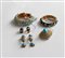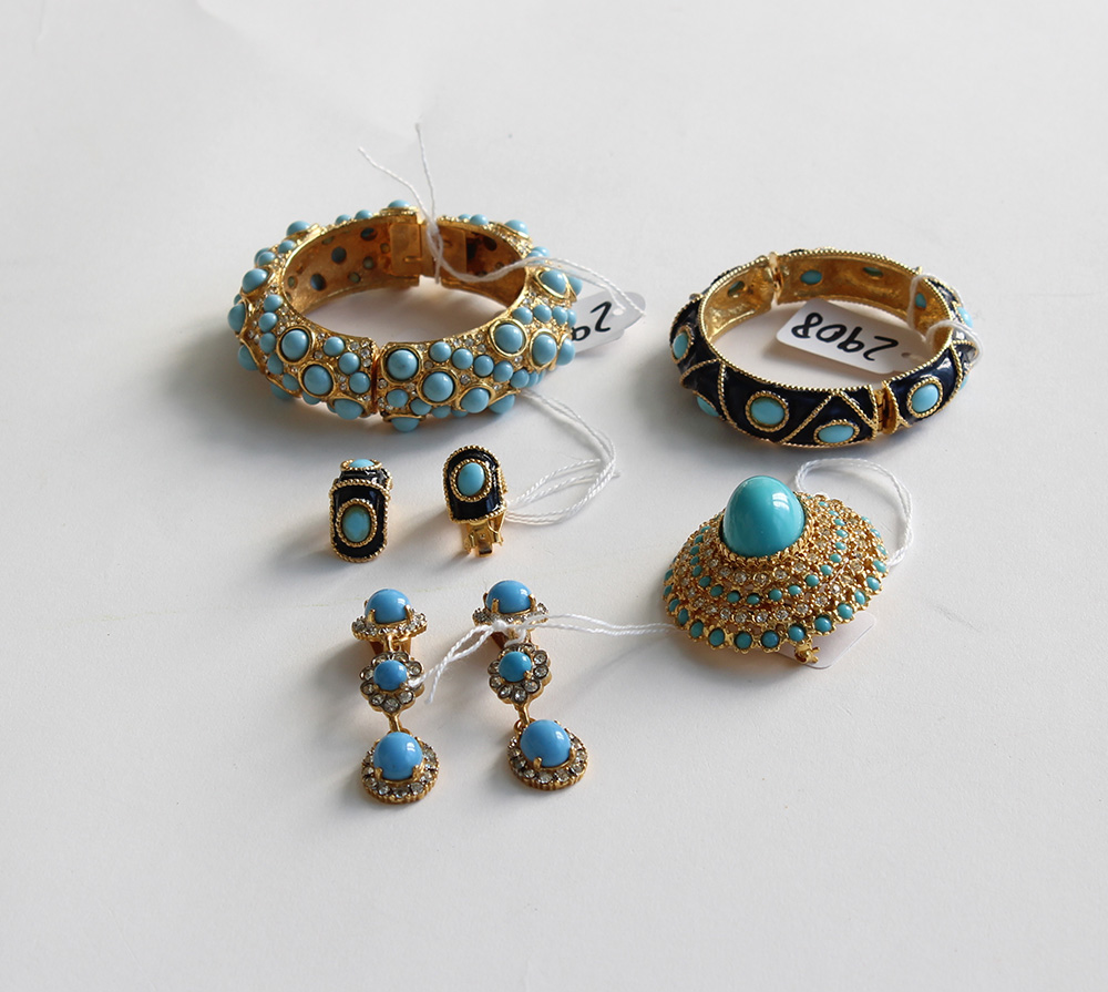 Lotto composto da due bracciali rigidi due paia di orecchini e una spilla, tutti in metallo color oro rifiniti con cabochon color turchese alcuni rifiniti con strass e una demi parure con smalto blu scuro