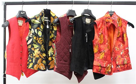 Lotto di cinque gilets: uno in fustagno trapuntato con schiena in foulard nei toni del bordeaux, uno in camoscio nero con schiena in foulard, uno in bourette di seta rossa con schiena in foulard, due interamente in foulard con cerniera (tg. 40-46)