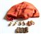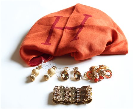 Lotto composto da una doppia sciarpa in garzina di seta e cachemere nei toni dell'arancio e del bruciato, un bracciale e tre paia di orecchini, tutto in metallo color oro con grande pietra, strass e cabochon color corallo
