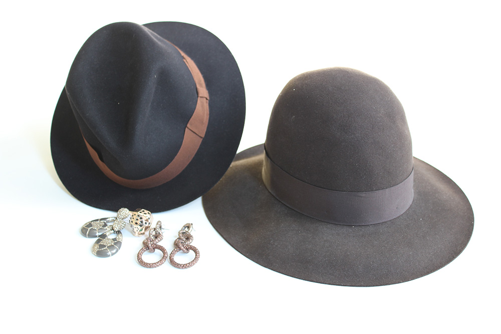 Lotto composto da due cappelli in feltro nei toni del nero e marron come le due paia di orecchini rifiniti con strass, uniti ad un anello in argento 925 con galvanica oro a ricordare una pantera con smalti neri e strass verdi (tg. 57)
