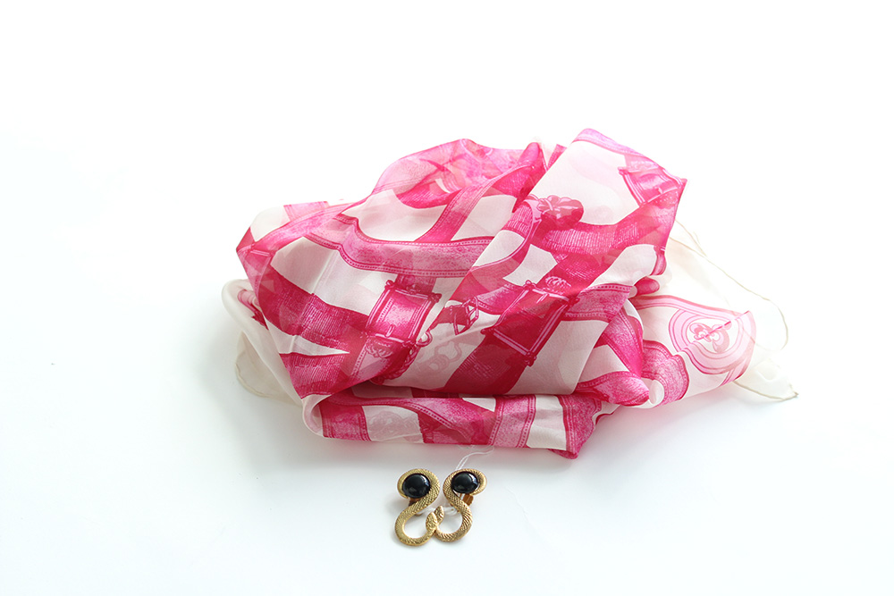 Lotto composto da un foulard in chiffon "Cavalcadour" nei toni dell'avorio e fucsia e un paio di orecchini a forma di serpente con demi-boules nere