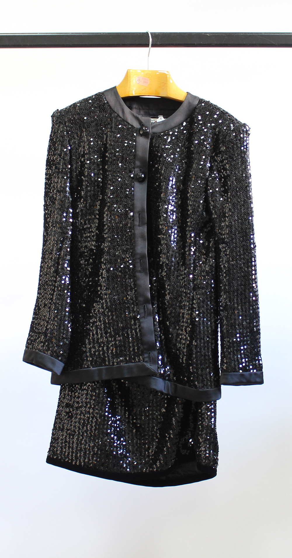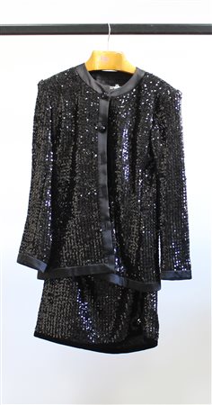 Tailleur, giacca con gonna, in paillettes e raso di seta nero (tg. 40) (lievi difetti)