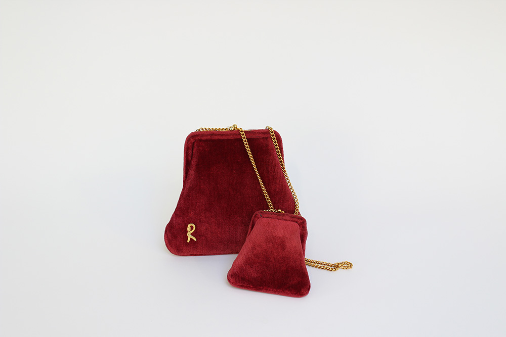 Borsetta con borsellino a tracolla in velluto color rubino, logo e dettagli in metallo color oro, interno in pelle (cm 18) (segni d'uso)