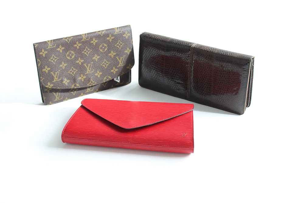 Lotto di tre pochettes. Una in cuir épi rosso, una in tela Monogram e una anonima in lucertola testa di moro. Misure diverse (gravi difetti)