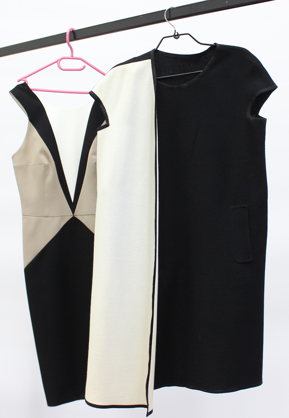 Lotto di due vestiti uno in crêpe nera e bianca senza maniche a portafoglio, l'altro con spalline nei toni del beige, bianco e nero (tg. 42)
