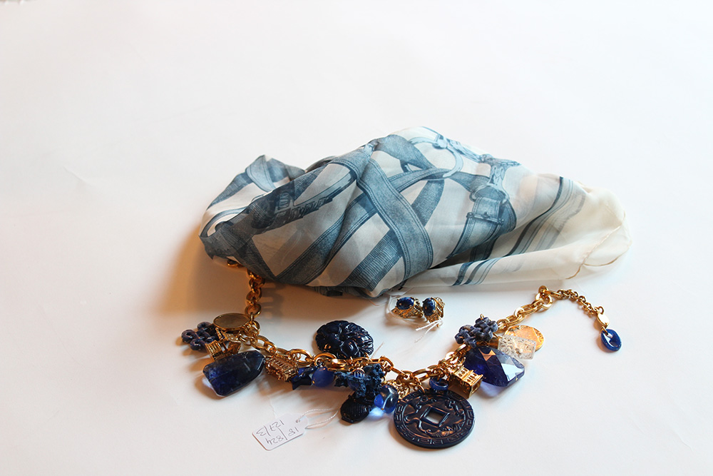 Lotto composto da un foulard in chiffon nei toni dell'avorio e blu, un collier con charms ad imitare i lapislazzuli, come gli orecchini, tutto in metallo color oro e strass