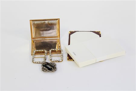Lotto composto da un portacipria in metallo color oro con custodia in moiré e un piccolo notes da tasca con scorta di carta marchiato Cartier unito a tre fibbie in metallo e strass (segni d'uso) (segni d'uso)