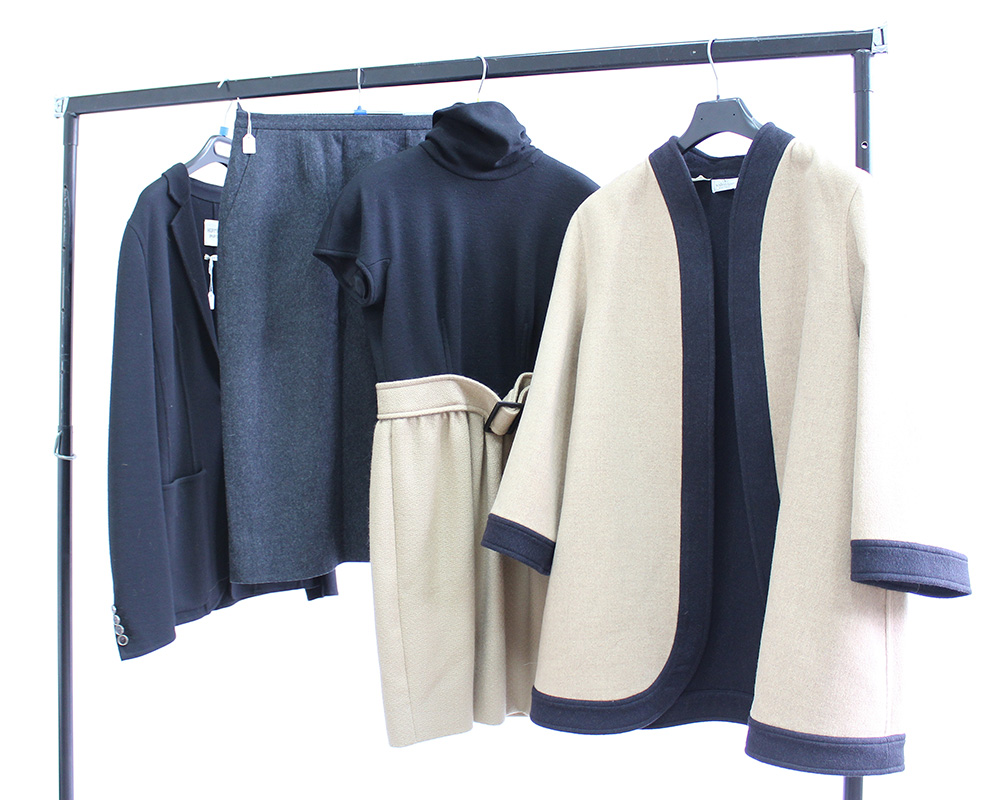 Lotto composto da una giacca in maglia nera, una gonna grigia fumo di Londra, un vestito in maglia beige e nero e un cappotto in double beige e nero (tg. varie) (difetti e segni d'uso)