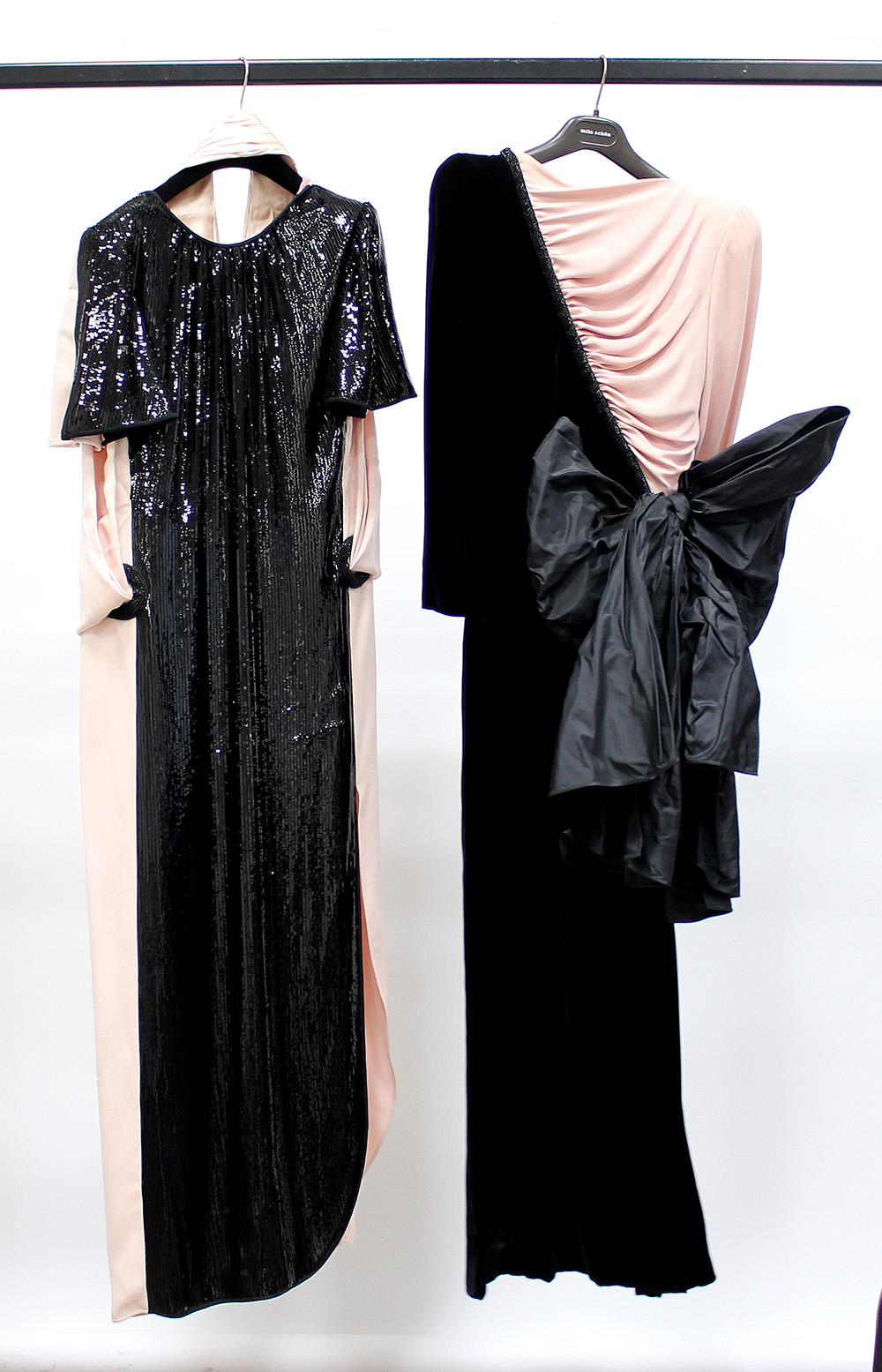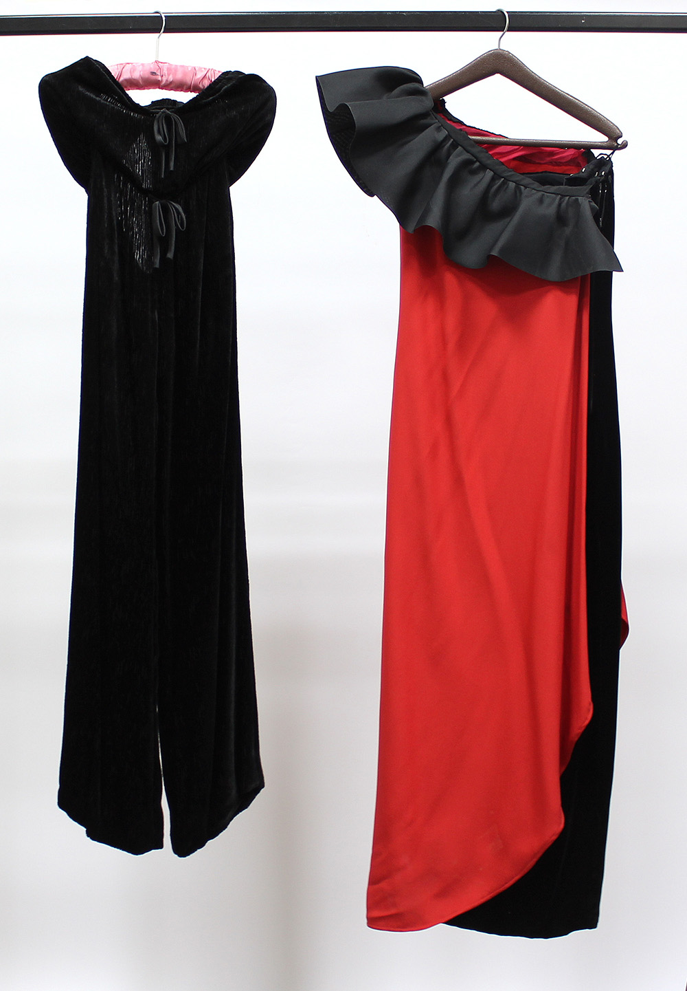 Lotto composto da una tuta pantalone in velluto nero senza maniche e tre vestiti lunghi di cui uno monospalla rosso e nero (tg. differenti) (difetti)