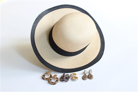 Lotto composto da un cappello in paglia nei toni del crema e nero e quattro paia di orecchini nelle nuances crema e terra