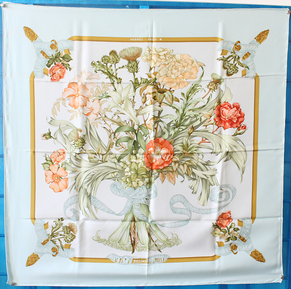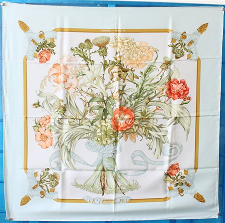 HERMÈS Foulard in seta "Regina", Leila Menchari 1972, toni pastello bordo...