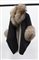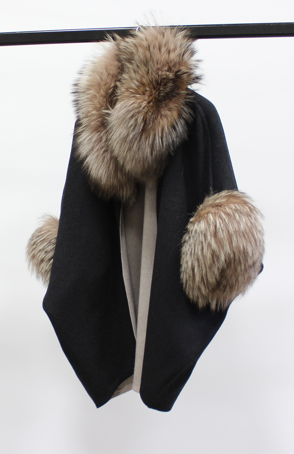Giaccone in double grigio fumo di Londra e panna, maniche a pipistrello, collo e polsi in pelliccia (tg. 42)