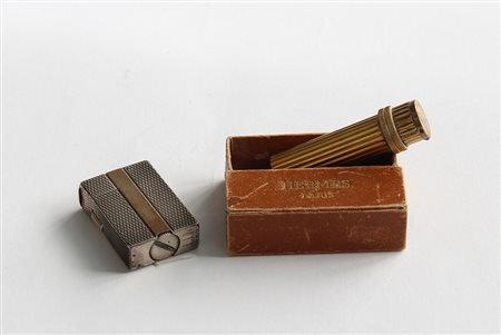 Lotto di due accendini, Hermès "lipstick" lighter in metallo placcato oro con scatola originale e Dunhill in argento