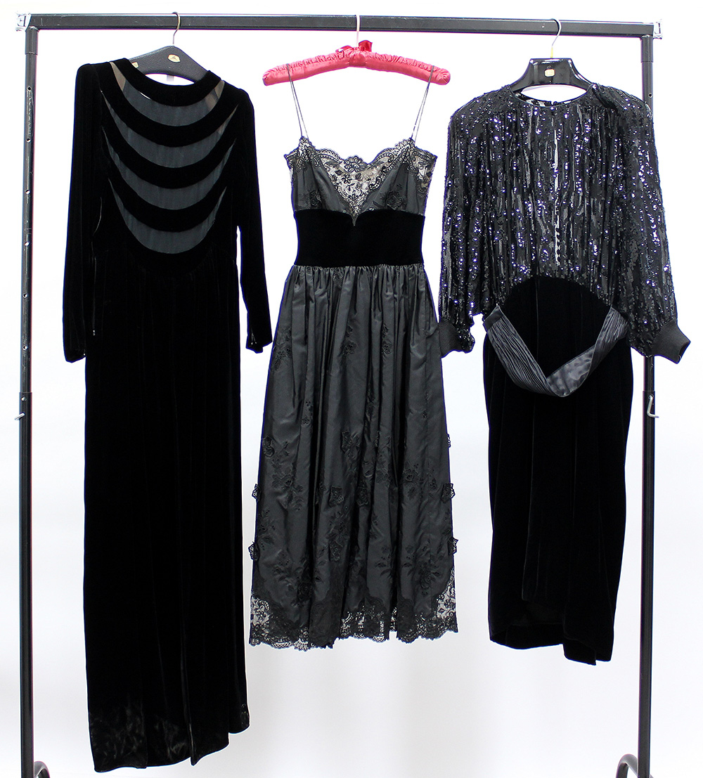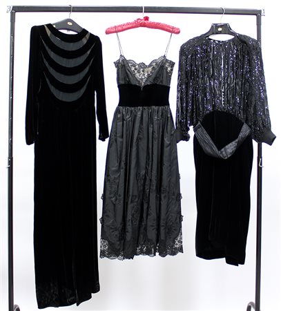 Lotto di tre vestiti da gran sera di vari modelli e materiali, tutti di color nero (tg. Differenti) (lievi difetti)