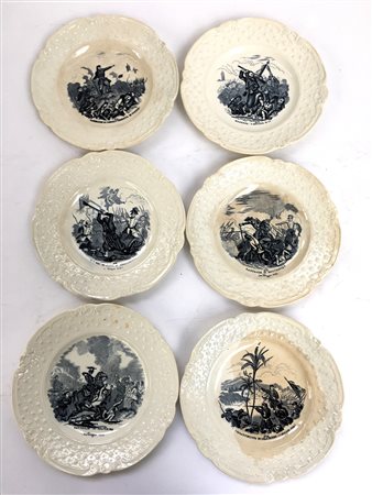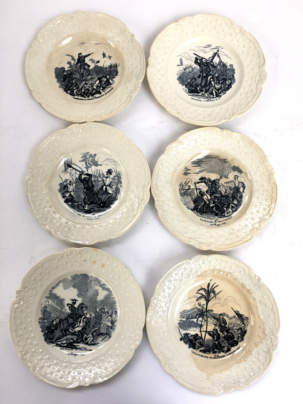 Interessante serie di sei piatti in ceramica smaltata bianca con all'interno stampa monocromica riproducente fatti d'arme della seconda guerra d'indipendenza.