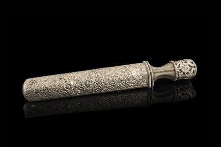 Impugnatura in filo ritorto con parte superiore in metallo argentato traforato.
