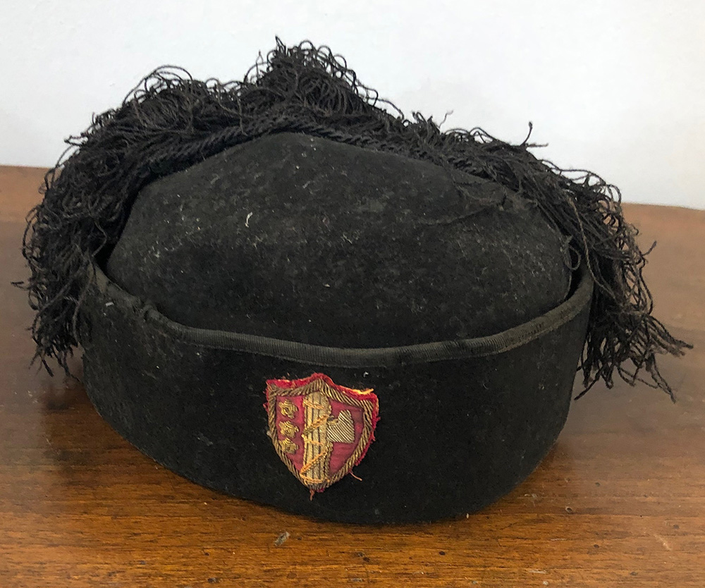 Fez Pnf in feltro nero con stemma ricamato in canottiglia dorata. Interno presente ma danneggiato. Marchio della ditta Pomé di Sassari.