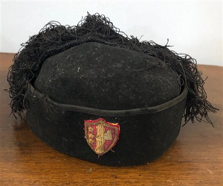 Fez Pnf in feltro nero con stemma ricamato in canottiglia dorata. Interno...