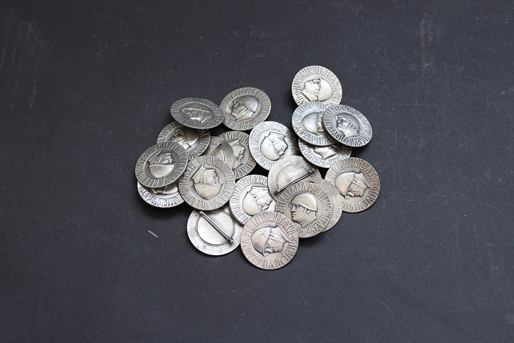 Lotto di distintivi della gioventù italiana del littorio in patina. Produzione fratelli senesi, Milano.